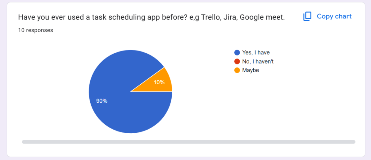 We asked responders if they had used a task scheduling app before to task management, and meeting scheduling. 90% of responders claimed that they were familiar with a task management app. This shows that people are familiar with these solutions.