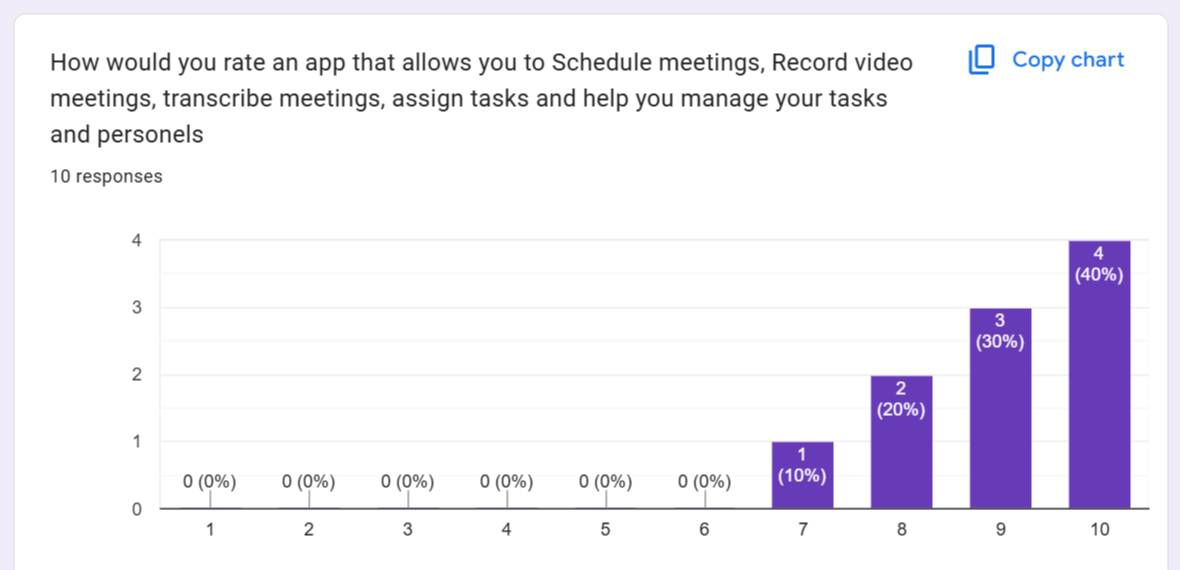 We wanted to know if an app that allows them to Schedule meetings, Record video meetings, transcribe meetings, assign tasks, and manage tasks was important to them. From the responses we got, we are positive it will be a useful solution.