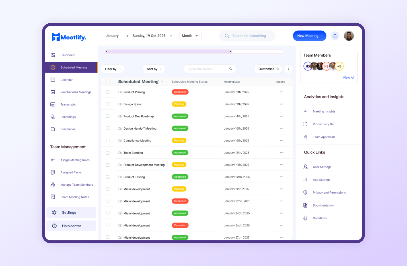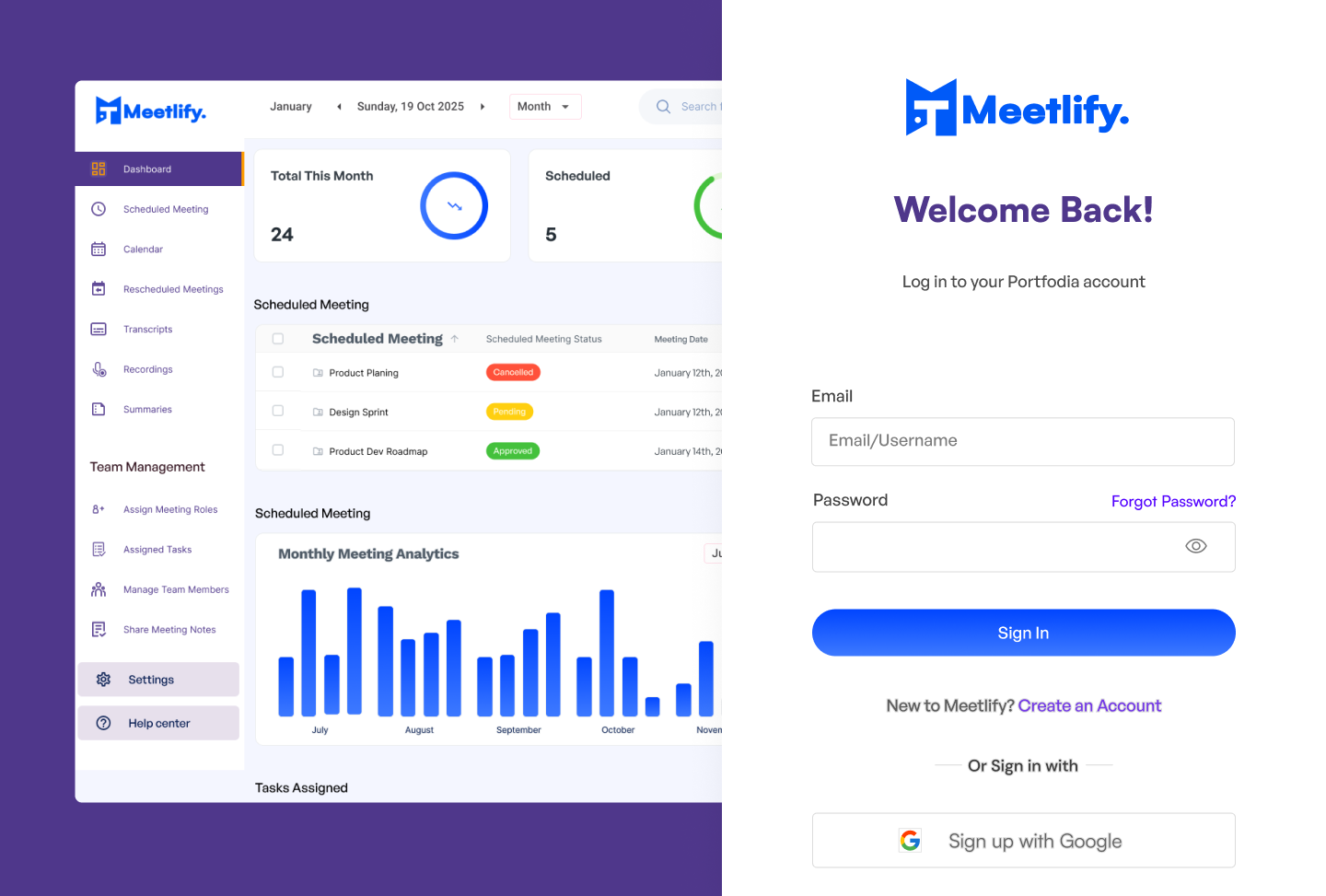 1. Dashboard – Quick access to upcoming meetings and scheduling tools.