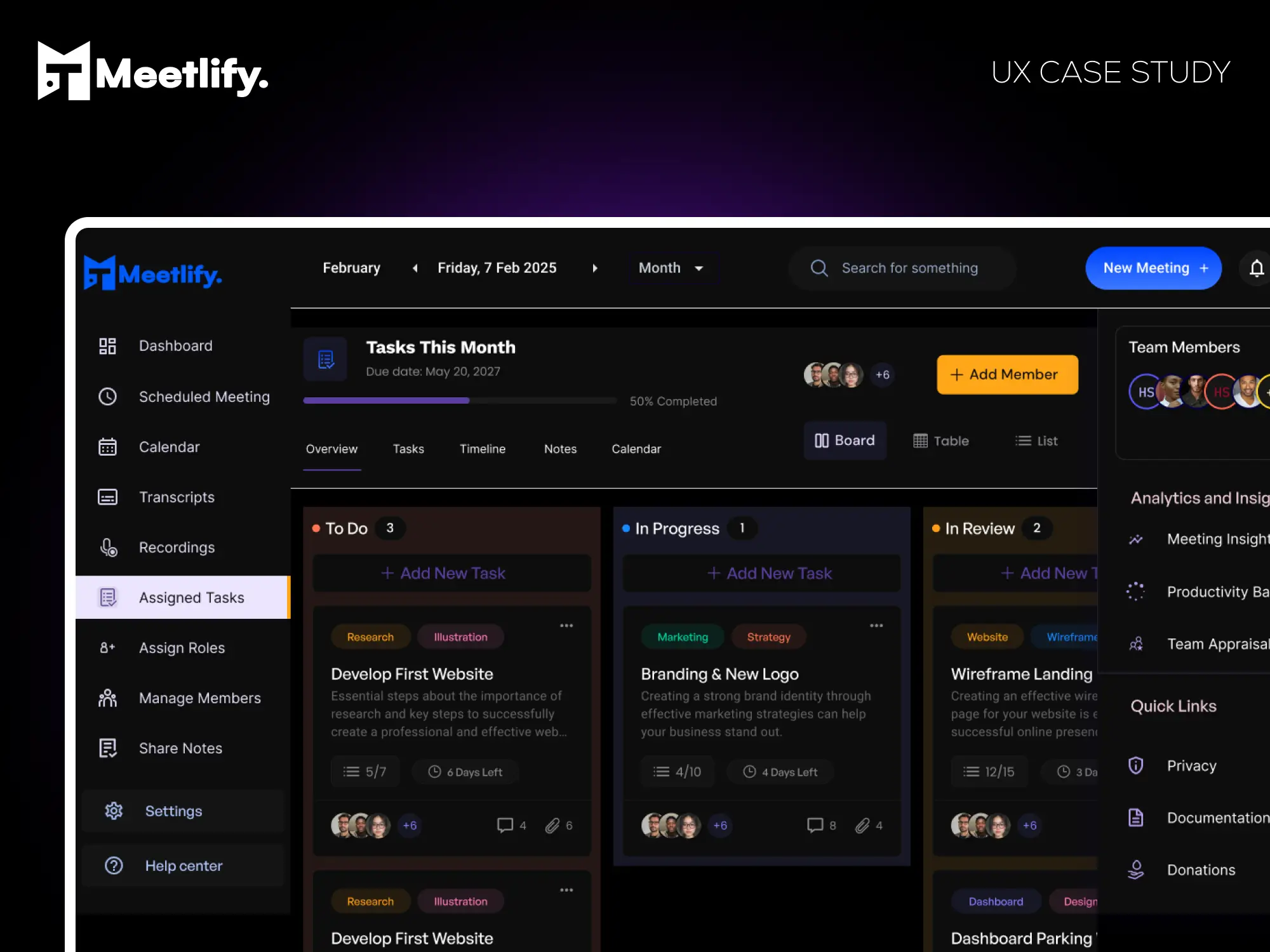 Meetlify is more than just a scheduling app—it’s a productivity tool designed to make meetings seamless and effective. Through an iterative UX process, I was able to create a solution that simplifies team collaboration.